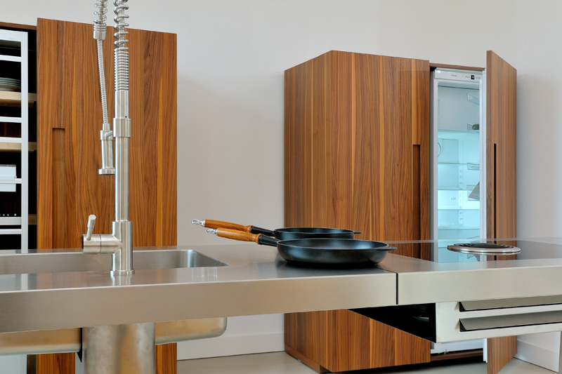Kleine bulthaup b2: Nussbaum in Kombination mit b3 und Edelstahl-Werkbank, Geräte unter der Treppe in der Wand montiert