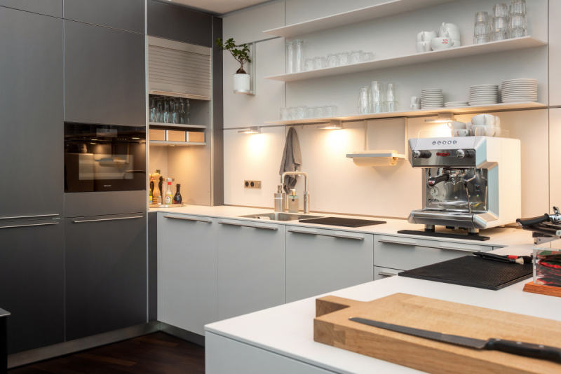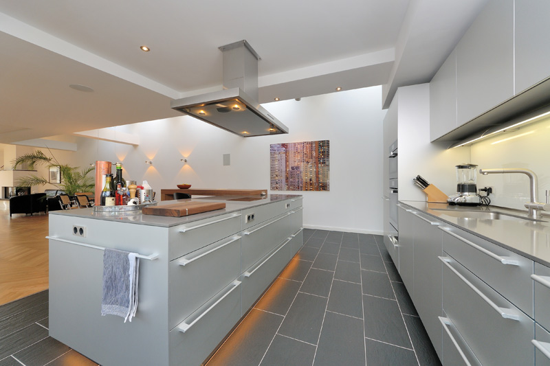 bulthaup b1 in kiesel mit einer schönen außergewöhnlichen Haube von bulthaup und einem Regal mit Schiebetür von bulthaup