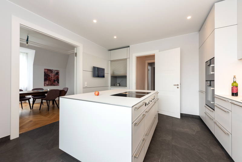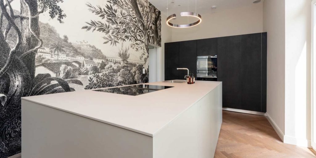 bulthaup b3 in kaolin am Olympiastadion in Berlin. Geräte von bora und Gaggenau. Nischenpaneele von bulthaup mit Bord und in die Dachschräge laufend.